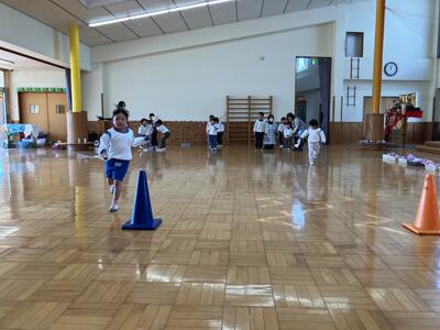 コマを回したり一生懸命走ったり、年長さんと一緒に遊ぶことを楽しみました。