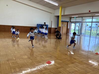 ラグビーボールを転がしたり、持って走りました。