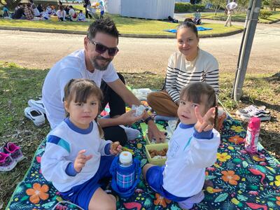 お家の人と一緒にお弁当タイム!青空の下たくさん遊んだ後のお弁当は格別の味がしました。