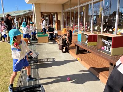 遠くの的をめがけてボールを「えいっ!」当たったかな??